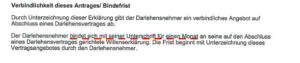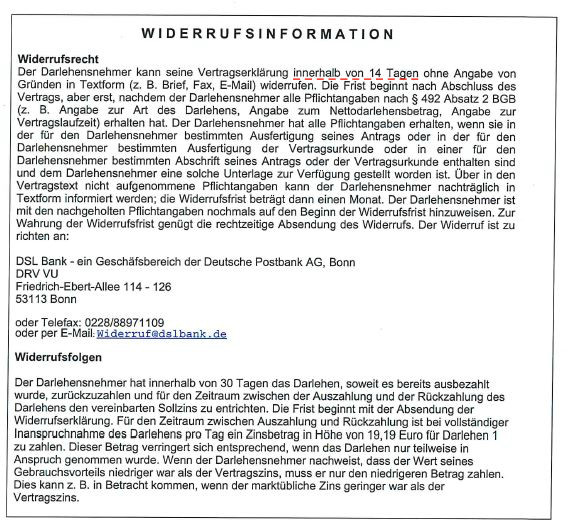 Grundsätzlich sieht das Gesetz ein 14-tägiges Widerrufsrecht vor, welches beginnt, sobald der Kreditnehmer eine bestimmte Reihe von Pflichtangaben erhalten hat und über sein Widerrufsrecht belehrt wurde. So lautet auch die entsprechende Formulierung in der Widerrufsinformation der DSL-Bank. So weit so gut. Schaut man sich jedoch das Blatt an, welches der Widerrufsbelehrung unmittelbar folgt, findet sich dort ein verwirrender Hinweis, wonach sich der Darlehensnehmer für einen Monat an seine Vertragserklärung bindet. Solche Unklarheiten hinsichtlich der Dauer der Widerrufsfrist führen zu der Unwirksamkeit der Widerrufsbelehrung insgesamt, fand z.B. auch das Landgericht Hamburg (Az.: 325 O 42/16).