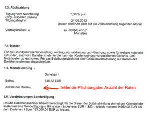 Ein weiterer, noch gröberer Fehler, findet sich nicht in der Widerrufsbelehrung, sondern in den Kreditverträgen der ING DiBa selbst. Bei der Vergabe der Immobiliendarlehen sind die Kreditinstitute gesetzlich verpflichtet, in die Vertragsurkunde bestimmte Angaben aufzunehmen. Dazu gehören z.B. der Nettodarlehensbetrag, die Höhe des Sollzinssatzes und auch die gesamte Vertragslaufzeit. Schließlich muss der Verbraucher deutlich vor Augen geführt bekommen, wie lange er sich tatsächlich an die Vereinbarung bindet. Das können bei Annuitätendarlehen ohne Weiteres drei Jahrzehnte sein. Betrachtet man allerdings die Vertragsdaten, die bereits auf der ersten Seite der Urkunde abgebildet sind, fällt schnell auf, dass die Angabe zu der Vertragslaufzeit fehlt. Die einzige zeitliche Angabe ist die Dauer der Zinsbindung, die in der Regel 10 bzw. 15 Jahre beträgt. Nach dem Ablauf der Zinsbindung ist die Darlehenssumme aber noch lange nicht zurückgezahlt. Bei der Rechtsfolge ist das Gesetz eindeutig – fehlt eine Pflichtangabe wie die Vertragslaufzeit, fängt die Widerrufsfrist nicht zu laufen an. Hier sticht der Widerrufsjoker also weiter.