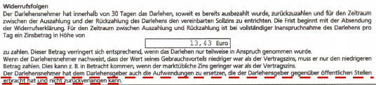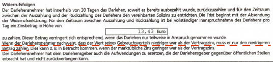 Ein häufig anzutreffender Fehler liegt in einer unzureichenden Aufklärung über die Widerrufsfolgen. In zahlreichen Widerrufsinformationen fehlt nämlich der Hinweis auf eine Möglichkeit des Darlehensnehmers bei der Rückabwicklung unter Umständen einen geringeren Tageszins zu zahlen.