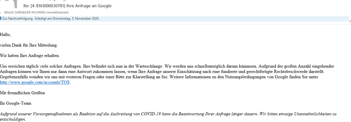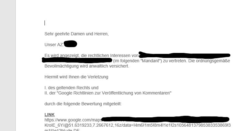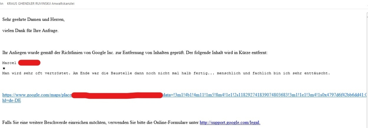 Google is bound by the so-called Blogspot criteria of the BGH. It assesses reviews based on a concrete presentation of the facts and a corresponding legal assessment. This legal examination is reserved for lawyers (Section 2(1) German Act on Out-of-Court Legal Services (RDG)).